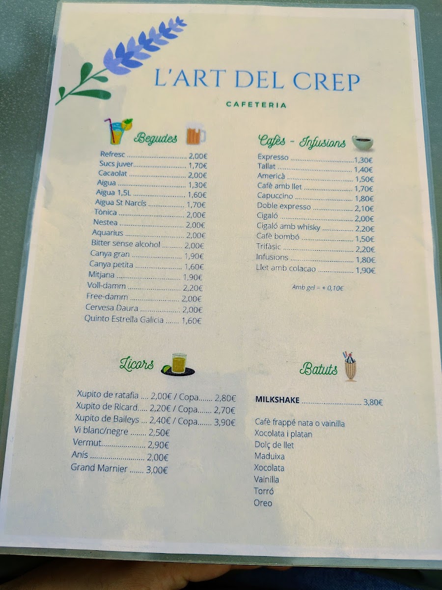The menu offers a variety of food and beverage options suitable for breakfast, coffee breaks, and light meals. Visitors can find a selection of crepes, both sweet and savory, as well as sandwiches and smoothies. Coffee and other hot drinks are also available, making it a convenient choice for casual dining or a quick order.